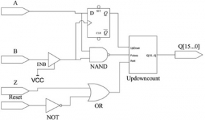 該測試模塊需要從天線平臺測試仿真轉臺接受平臺的位置信息,在各類運動控制系統中,常采用增量式光電編碼器作為反饋檢測元件,其輸出為相差90度的A、B兩相信號以及周期脈沖復位信號Z,A、B兩相信號相差的正負決定運動的正反方向,A、B兩相信號的脈沖輸出計數決定位置運動的大小,Z為過零復位脈沖。整個解碼邏輯設計如圖2所示。