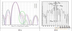 副瓣抑制是天線的重要指標,目前通常考核垂直面方向圖的第一上旁瓣,如圖3所示。但在一定頻段內,總有一些頻點的第一上旁瓣很不明顯,似乎未按預定位置出現,容易將第二上旁瓣誤認為第一上旁瓣,如圖4、圖5所示,導致指標評判錯誤。對此,當第一副瓣不明顯時,需要在預定的第一零點和第二零點之間的角域內找最大值來確定,通常是1~2倍θ3dB角域,如圖6所示。另外,也可按上側某個角域范圍內的副瓣電平進行評估,如從1倍 θ3dB處~30度范圍內,這樣既可避免上述情況,也有利于網絡覆蓋效果。