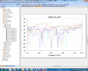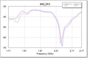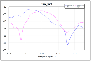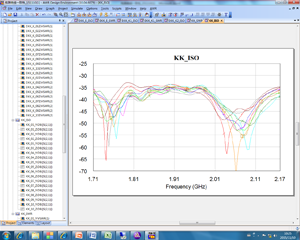天線性能的一致性是指同一型號(hào)的天線產(chǎn)品的參數(shù)表現(xiàn)的吻合性,可以通過(guò)比較多個(gè)同類型產(chǎn)品的指標(biāo)曲線的近似度來(lái)判斷。如圖4所示,為同一類型的多個(gè)天線電壓駐波比曲線的一致性對(duì)比,左圖的多個(gè)天線駐波比曲線趨勢(shì)一致,偏差較小,表明該類型天線駐波比性能比較一致;右圖的多個(gè)天線的駐波比曲線沒(méi)有規(guī)律,比較雜亂,表明該類型天線的駐波比性能一致性較差。圖5為天線隔離度性能的一致性比較,同樣左圖天線比右圖天線隔離度參數(shù)的一致性要好。因此,可以認(rèn)為,左圖天線性能的一致性要好于右圖的天線。